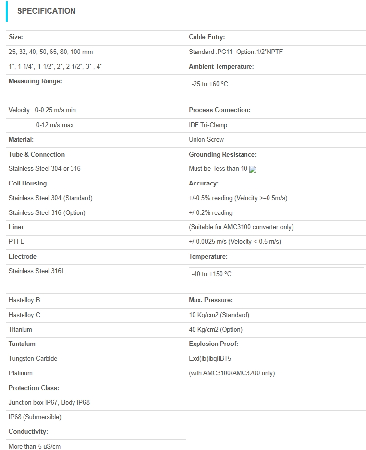 AMF601 Series is a sanitary type electromagnetic flowmeter ideal for conductive liquids. It comes in sizes from 25mm to 100 mm. The AMF601 is widely used for drink water, milk, food & beverage juice and many other industrial fluid. AMF601 Series electromagnetic flowmeter could be used in compact or separate model with AMC Series converter of electromagnetic flowmeter.