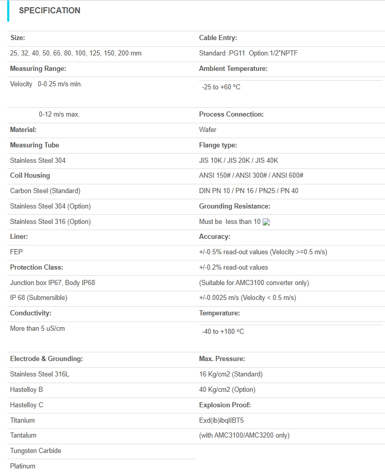 AMF500 Series is a wafer type electromagnetic flowmeter ideal for conductive liquids. It comes in sizes from 25 to 200 mm. AMF500 is widely used for tap-water, waste water, food & beverage, pulp & paper and many other industrial fluid. AMF500 Series electromagnetic flowmeter could be used in compact or separate model with AMC Series converter of electromagnetic flowmeter.