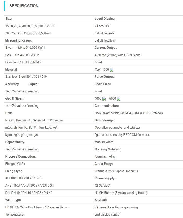 AVF7000 SeriesAVF7000 is a Vortex Flowmeter based on Von Karman theory of vortices generated by a bluff body in the pipe. The number of vortices are linearly proportional to the volumetric flow in the pipe. The AVF7000 is versatile flowmeter widely used for Gases, Steam & Liquid applications. There are no moving parts and comes with either flange or wafer connection. Standard configuration has local indication for flowrate and total flow as well as 4-20mA with HART signal and pulse output functions. The microprocessor design can filter out erroneous signals as well as interfence caused by pipe vibration.
