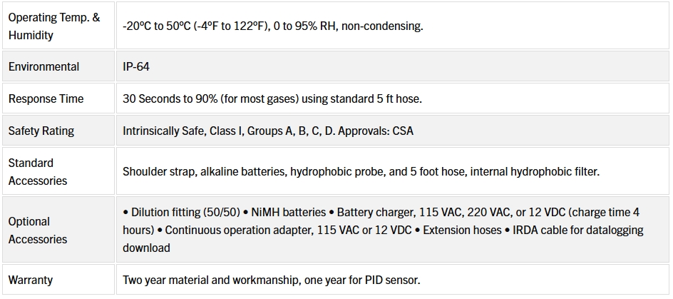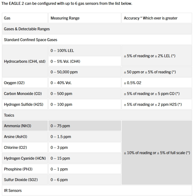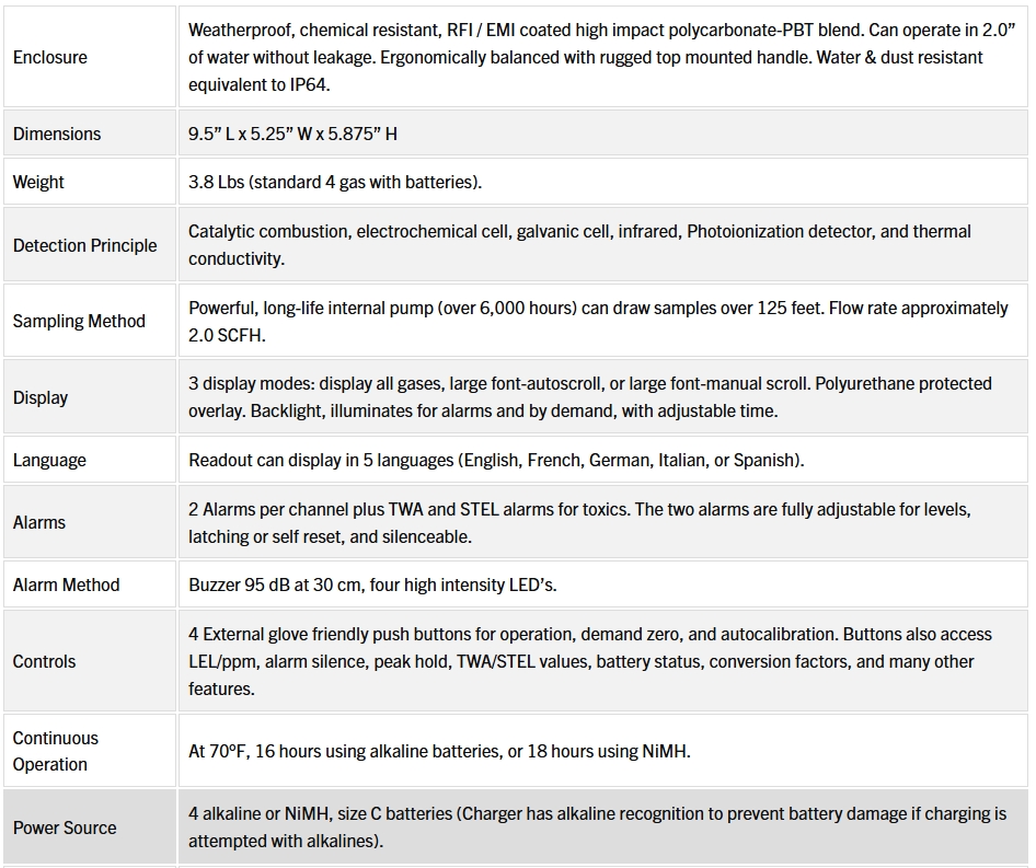 The PID sensor is capable of detecting high or low ppm levels (0-50 & 0-2,000) of VOC gases. Other smart sensors include % volume capability for CH4 and H2 using a TC (thermal conductivity) sensor; ppm or LEL hydrocarbon detection at the push of a button; infrared sensors for CO2 (ppm or % volume), methane or hydrocarbons in LEL and % volume ranges; Optional LEL / ppm H2 specific sensor, methane elimination feature for environmental applications; and a variety of super toxic gases. EAGLE 2 is a powerful instrument that does more than just offer the standard confined space protection for LEL, O2, H2S and CO. Made In U.S.ASpecifications
