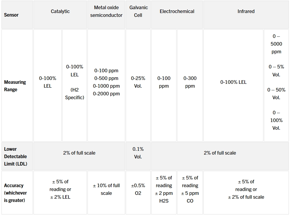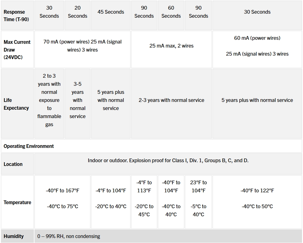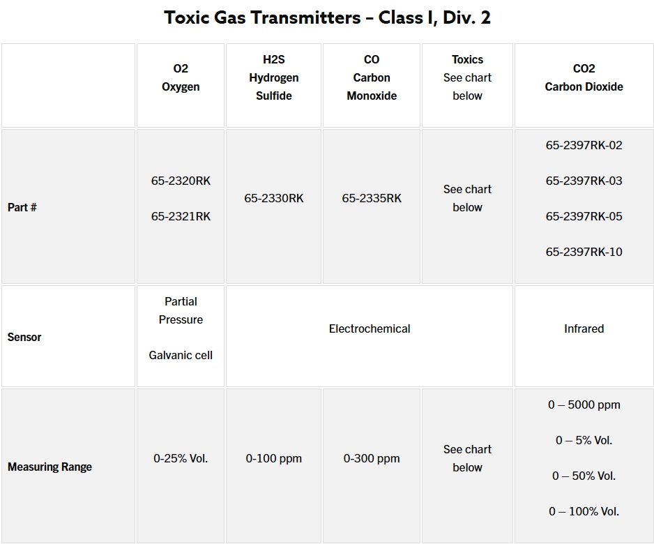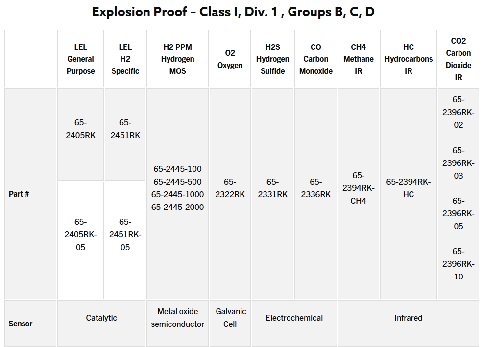 version is available for oxygen, H2S, CO, and CO2 in Class 1 Div 2. LEL sensors are available using catalytic bead and