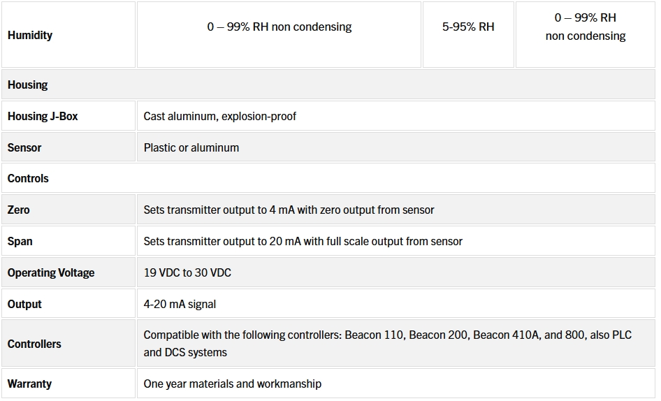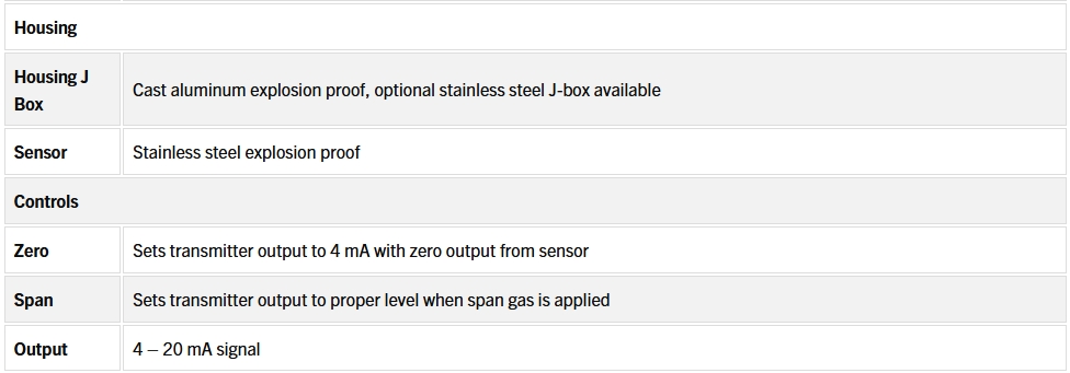 gases. The transmitters for LEL, H2 Specific, Oxygen, H2S, CO2, and Carbon Monoxide are explosion-proof with flame
