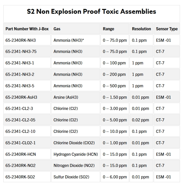 Class I, Div. 2 hazardous locations. Sensors available for NH3, AsH3, Cl2, ClO2, HCN, PH3, and SO2.