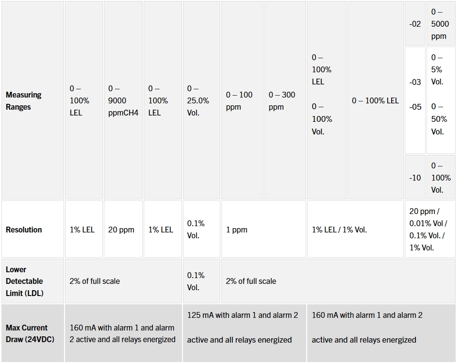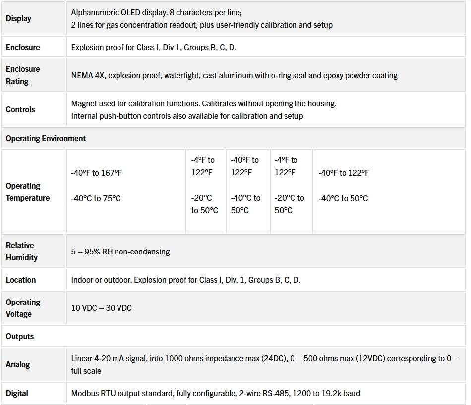 The transmitter provides a 4-20 mA output in addition to a Modbus digital output. It also has two levels of alarms with relays, plus a fail alarm with relay. A digital display of the gas concentration, as well as alarm and status lights, can be viewed through the front window.