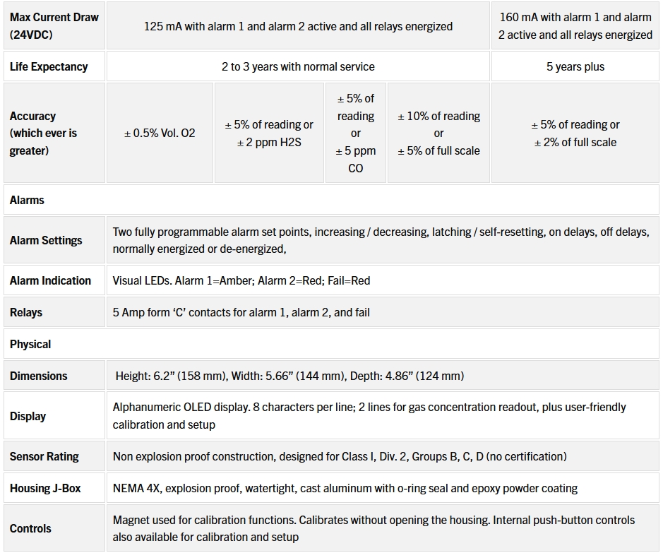 Specifications - Toxic Gas Transmitters (Class I, Div. 2)